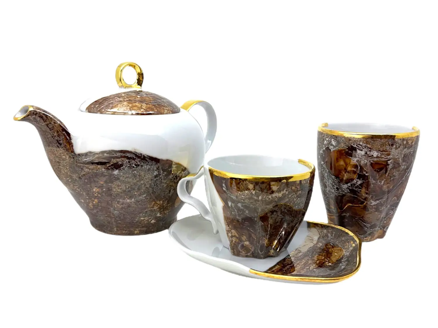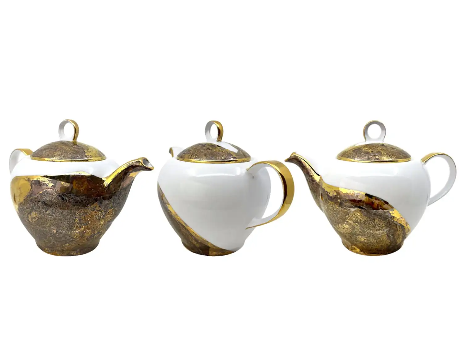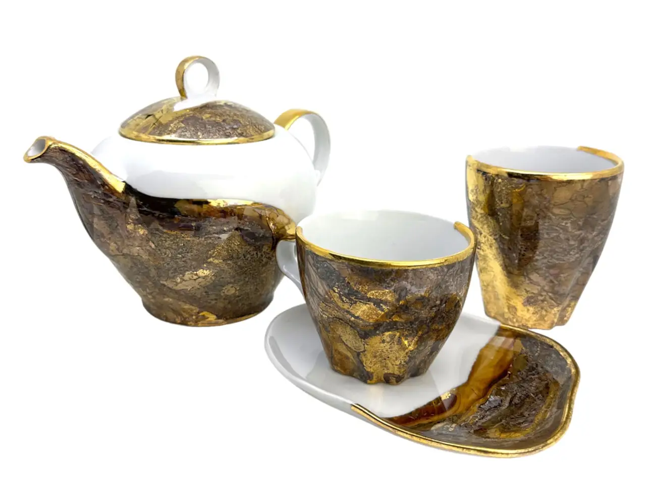 Sepia i złoto łączą się niczym symfonia wieków. Sepia otula porcelanowe naczynia w uścisku nostalgii, szepcząc opowieści z minionych epok. Tymczasem złote pociągnięcia, niczym promienie słońca przechodzące przez mgłę czasu, przywodzą na myśl królewską obfitość. Taniec kontrastów, w którym historia spotyka się z blaskiem. Razem sepia i złoto tworzą dzieło przechowujące szepty przeszłości i świetlistą obietnicę rozwijającej się przyszłości.