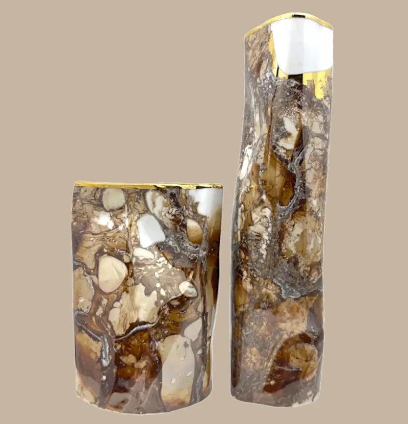 Sepia, ze swoim nacechowanym starożytnością urokiem, przywołuje wizje dawnych manuskryptów i uświęconych sal wielowiekowych bibliotek. Nosi w sobie dziedzictwo historii i tradycji. Dla kontrastu, złoto lśni jak skarby zapomnianych dynastii, rzucając ciepły, olśniewający blask. Emanuje atmosferą ekstrawagancji, symbolizuje bogactwo i elitarność, które pochodzą z pokoleń dobrobytu. Razem ręcznie malowane przez nas sepią i złotem naczynia tworzą subtelną atmosferę wytworności. Zapraszamy w sensoryczną podróż do eleganckich salonów, gdzie dziedzictwo gustu i klasy są szanowane ponad przemijające trendy.
